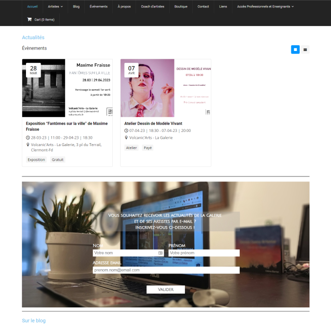 She said “I have had a website since the very beginning of this adventure. Online presence is major nowadays for artists and artshops, and to attract as many people as possible. My website is where you can see who I am, what I do, who my artists are, what they do, purchase some art and, of course, be informed of the current and upcoming events: exhibitions, art markets, workshops, etc. It is actually the main thing why the website was a necessity and why I worked - and still do - very hard on it. My newsletters have never really found their audience, and everyone know you should not rely exclusively on Facebook for events. Despite not having worked enough on my SEO, I have a pretty decent traffic on the website, and events are the first thing people see when they arrive on my homepage. So I needed something clean, attractive, and giving out the most important infos in an instant.”